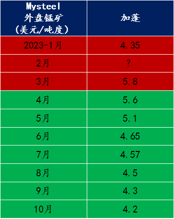 自2023年4月加蓬外盤報價隨市場行情同步下行,截至8月30日,康密勞2023年10月對華錳礦裝船報價加蓬塊為4.2美元/噸度(降0.1)。