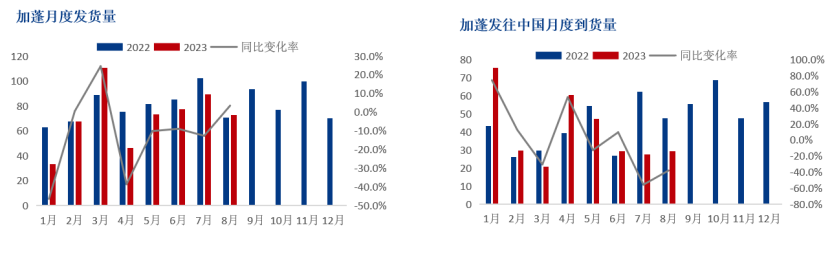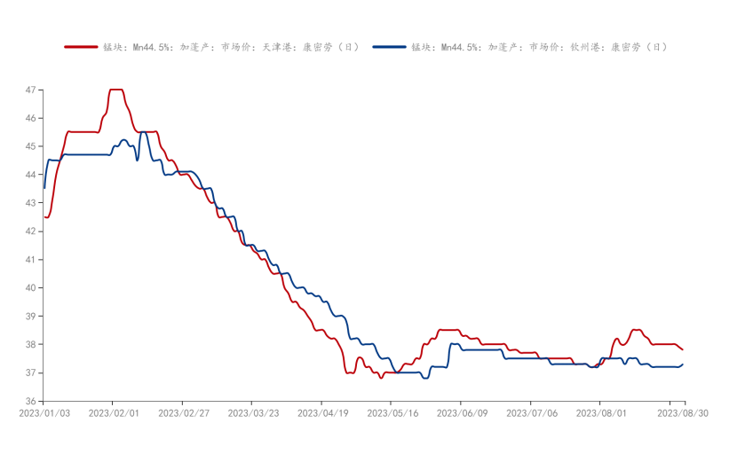 2023年年前受加蓬事故影響,發運及到港受阻,價格在春節前后出現明顯增幅,達到全年高點,進入2月下旬發運逐步恢復,價格持續陰跌至6月,6月到港量出現明顯縮減,疊加國內貨權逐步集中加蓬展開挺價操作,價格出現回暖,后期隨著9月預期到港量增加,現貨價格支撐性減弱,截至8月30日天津港加蓬37.8元/噸度,欽州港37.2元/噸度。