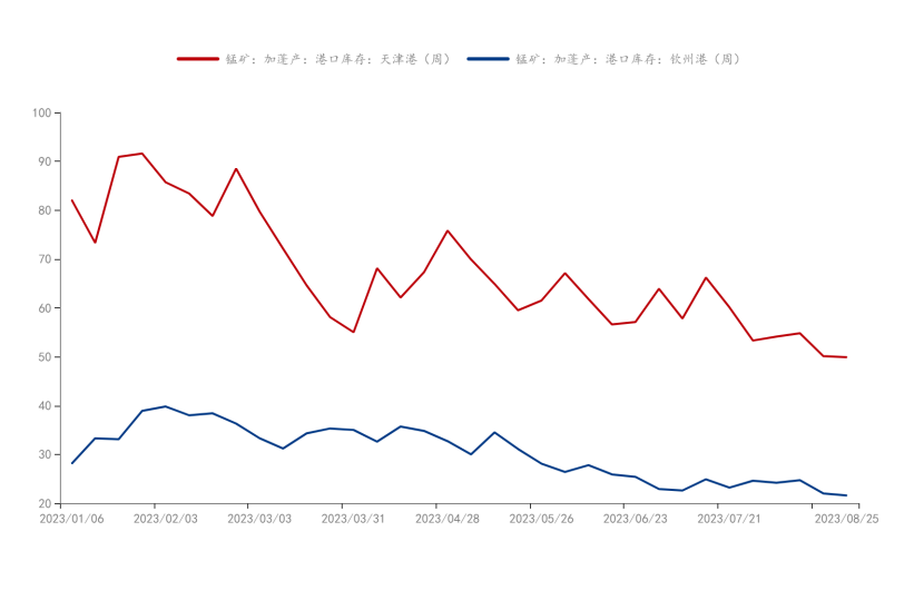 據Mysteel港口庫存顯示,截止本文發布(8月30日),天津港總量451萬噸,加蓬49.9萬噸,預計9月總到港量55萬噸,以目前備貨期周均6萬噸的疏港量來看,9月上半旬消費量在12萬噸,隨著國慶假期下半月消費量預計14萬噸左右,9月末庫存有望上升至78萬噸上下,處于年內相對高位。